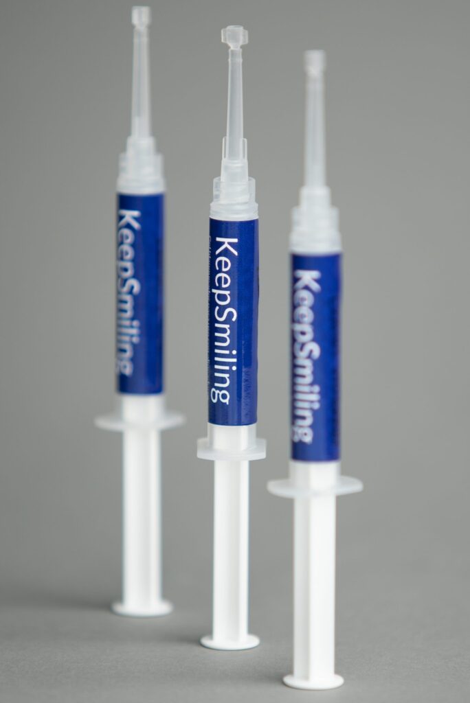 El blanqueador KeepSmiling se utiliza con el fin de aclarar algunos tonos del esmalte de los dientes. El producto viene presentado en una jeringa. No se debe aplicar directamente sobre los dientes, sino que se coloca el gel blanqueador sobre el alineador de canino a canino en forma de línea continua. Es importante que el producto no rebalse por fuera de la placa. Se recomienda utilizar entre ¼ y ⅓ de la jeringa por arco. Una vez que se vertió el blanqueador sobre el alineador, ya se puede colocar la placa con normalidad. Siempre asegurarse que el gel no toque las encías. Se puede retirar el excedente con un cepillo de dientes.